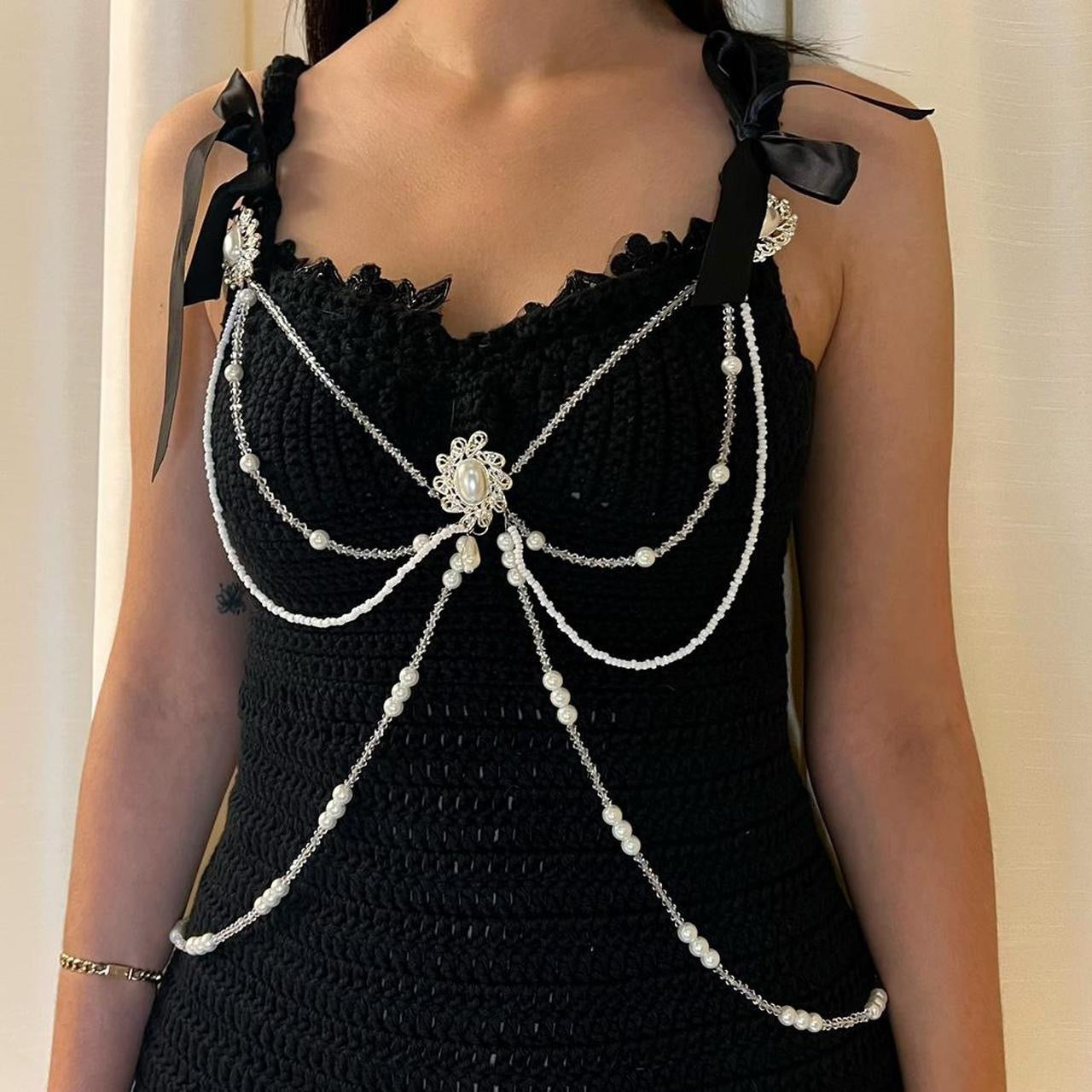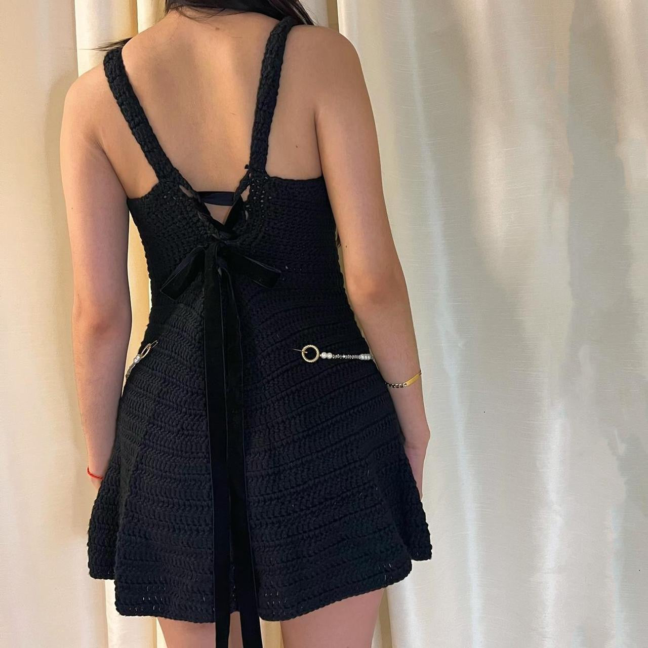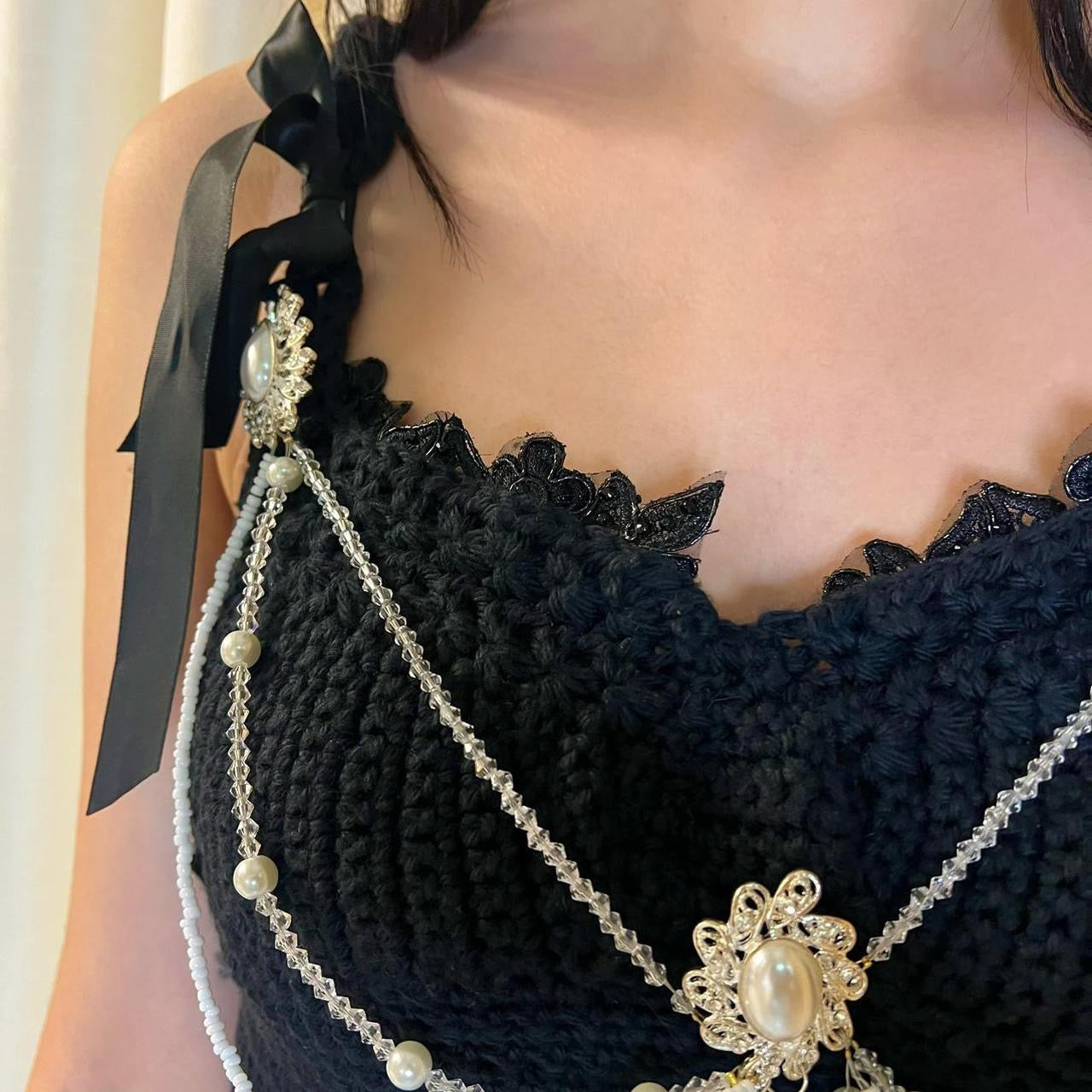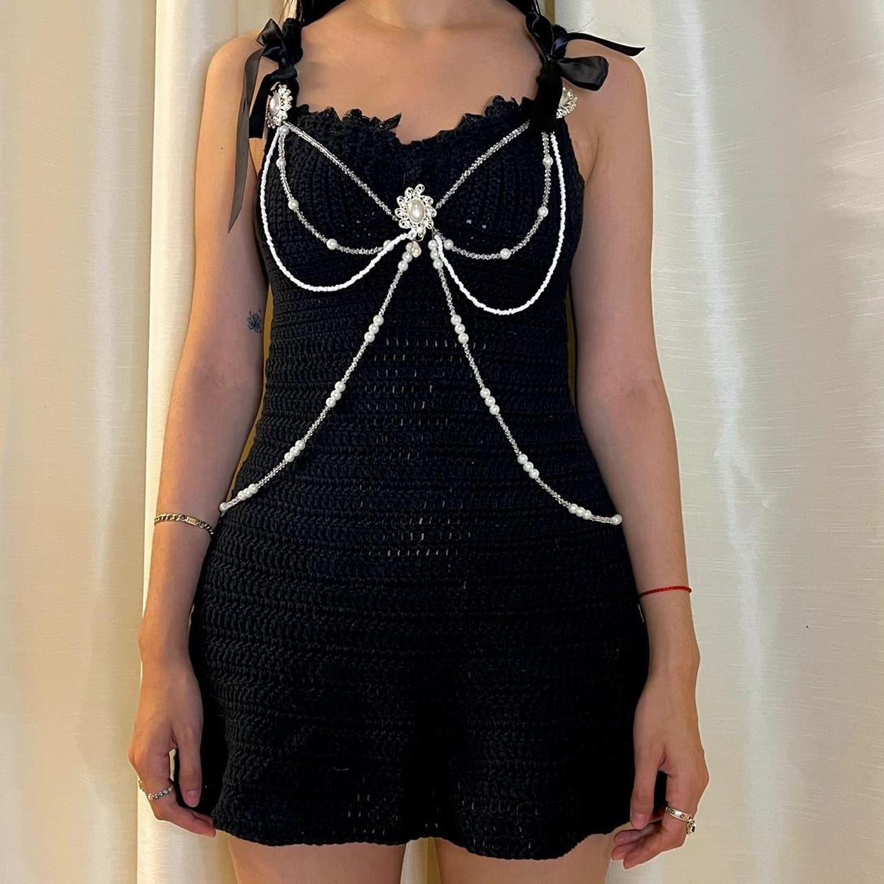 Obsessed with this Chanel-inspired whimsy goth/fairygoth black crochet mini dress! 🖤✨🐈⬛ It's all about the details: three stunning pearl brooches, bead drips, and a corset tie back with a velvet ribbon for that extra pop of texture. And don't even get me started on the bow straps and lace-trimmed bust. Very maximalist and chic. Style it up or down. Want it in another color or size? You got it. Ideal for raves, concerts, or a super cute date night in the city ♥️🪩🌃 ‼️this item ships in 3 weeks due to being completely handmade‼️