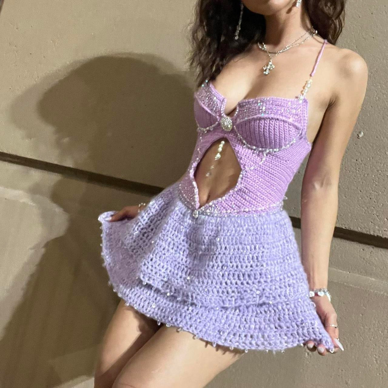 Super sexy mermaid/fairy core sparkly lilac mini dress Layered puff skirt with basque waistline, cutout, dangling pearls, crystal beads and so many more details!! Sooo beautiful and unique Corset style and adjustable straps!! Top also listed separately on my page 💞 Soooo pretty and unique, great for a rave or as a costume!! (I wore it to a concert) Can be made any color and size 💗💗💗 ‼️this item ships in 4 weeks due to being handmade‼️
