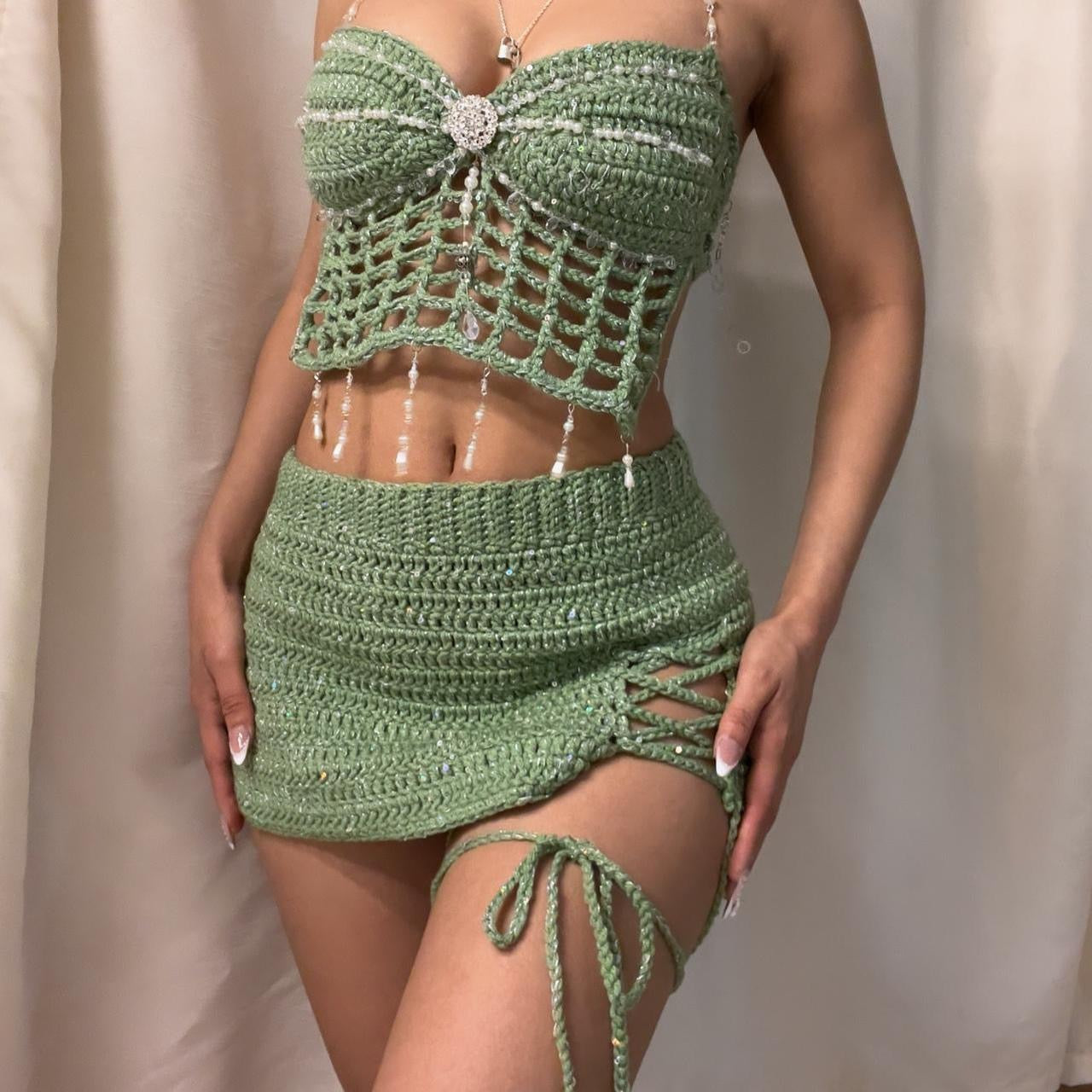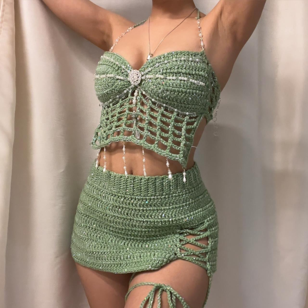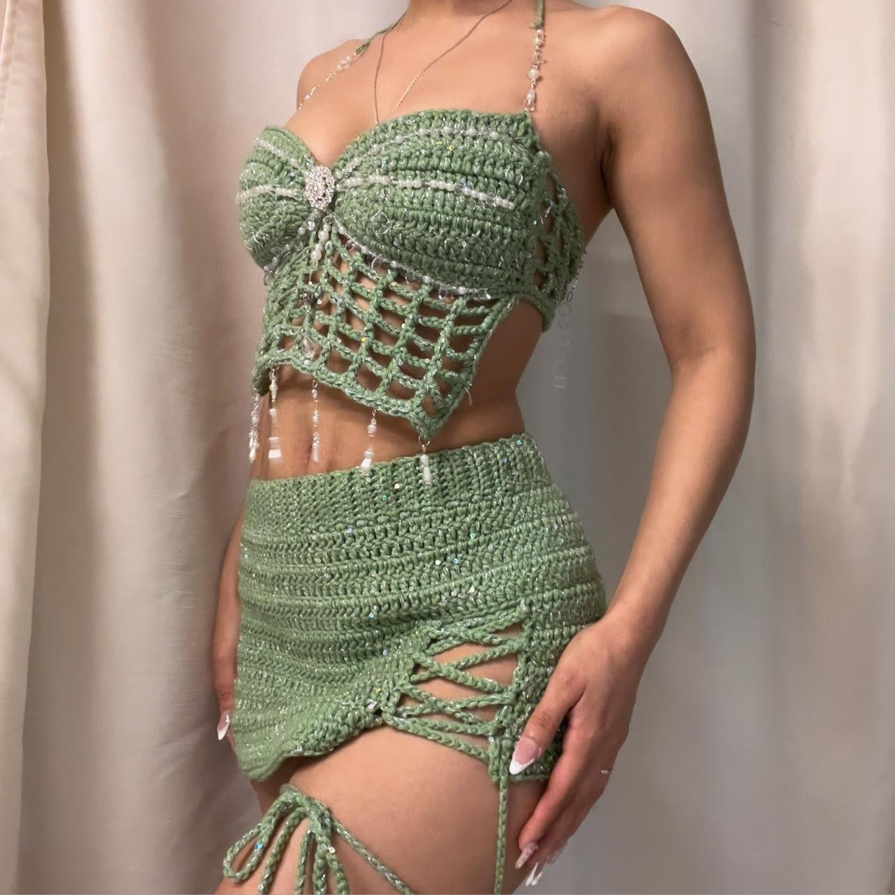 Super sexy mermaid/fairy core sparkly sage green bra top & skirt SET with dripping pearls 💗
